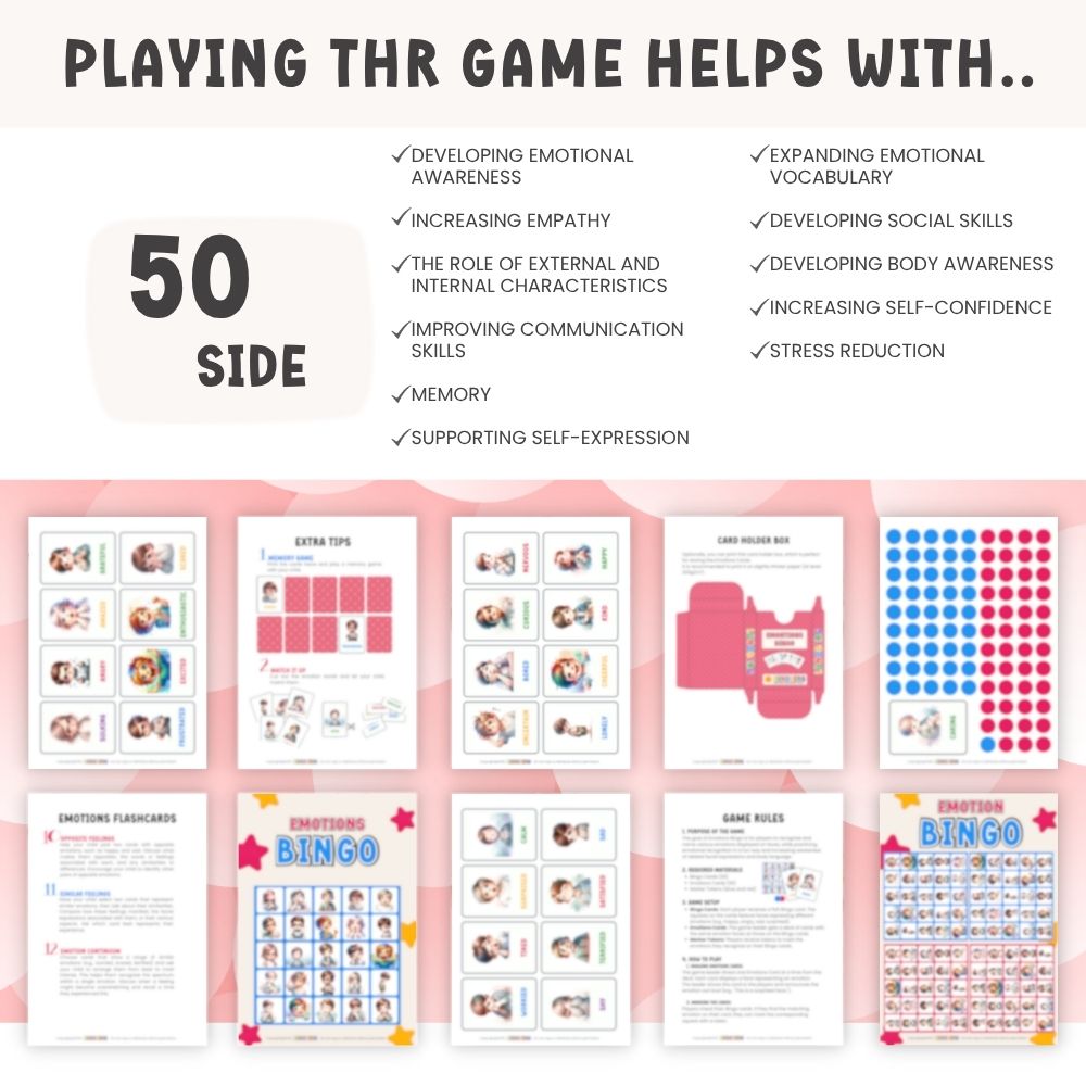 In this unique game, you’ll find 25 different Emotion Cards and 20 exciting Bingo Cards, helping children learn to recognize and express their feelings in a playful way. The set also includes 20+ creative game ideas, offering various ways to use the Emotions Cards in different scenarios, ensuring a fresh and engaging experience every time!